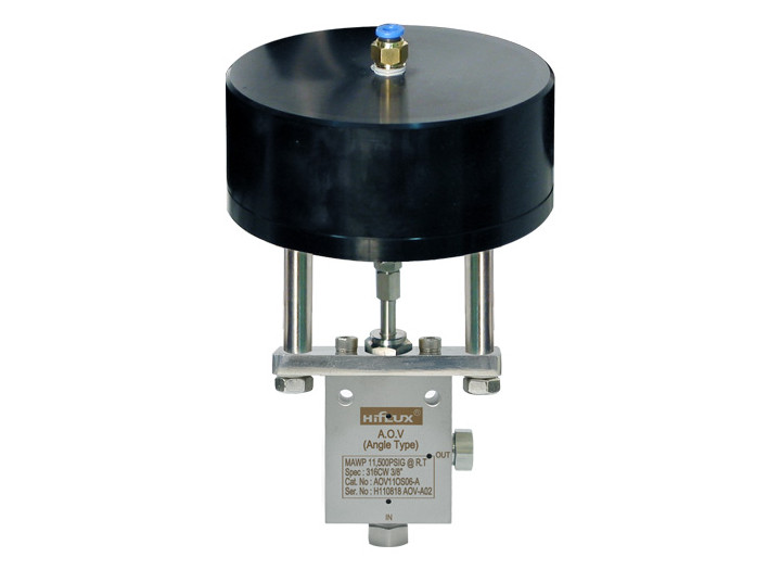 Normal Open Type : When valve is open in normal, if air is supplied, it will close automatically. The minimum working pressure of air is 5㎏f/㎠. Prevents galling due to the no-rotation stem. Packing designed for reliable sealing. Metal to Metal Sealing Type The underbody of A.O.V where liquid or gas passes through also have 4 types as needle valve. Air inlet port : 1/8" PT 6mm hose. 4-pattern body type. (Straight, Angle, 3Way/1on, 3Way/2on pressure type).