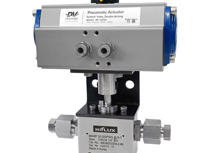 | Pneumatic Actuator ball valve can open or close the flow of fluid by operating the ball valve using air pressure. HIFLUX Ball valve is using trunnion-type ball with seat and possible to use in the low pressure and high pressure environment without leakage. Peek which is good for abrasion resistance, rub resistance and chemical resistance is used for seat. There are two types of ball valves : the 2-way type can open and close the flow of fluid, and the 3-way type (Diverter Type) can change the direction of the fluid. |