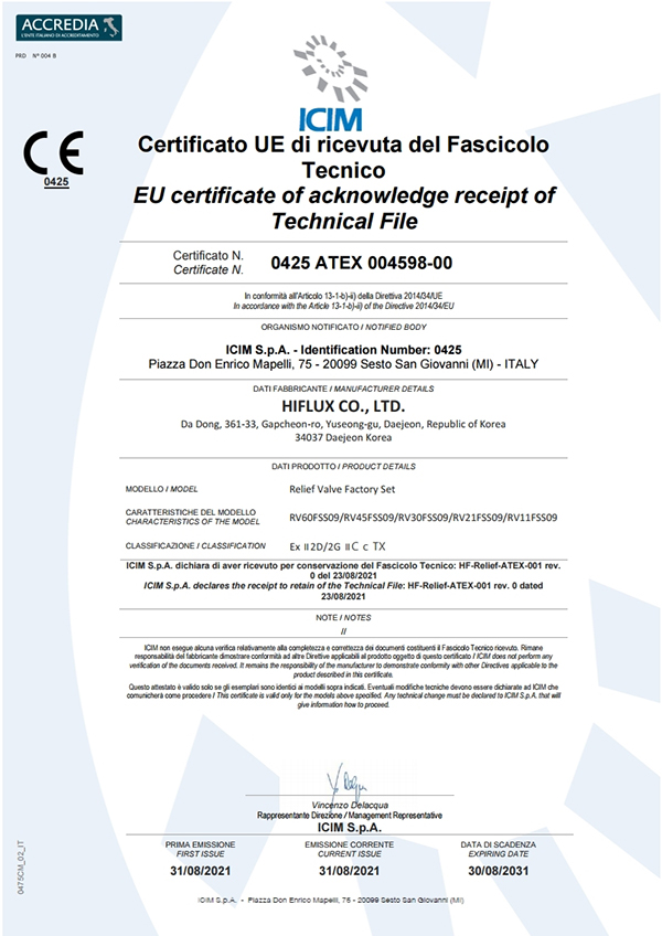 인증서 CE 인증서 - Relief Valve (Factory Set)