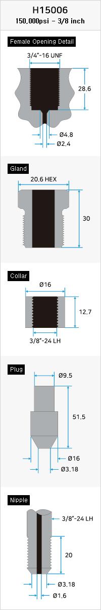 The product is tightened with collar and nipple in Gland. The applicable pipe size is as follows. This cone and threaded connection is the standard for easy and fast high-pressure equipment configuration with optimum sealing and reliable performance for both liquid and gas at high pressure and temperature.